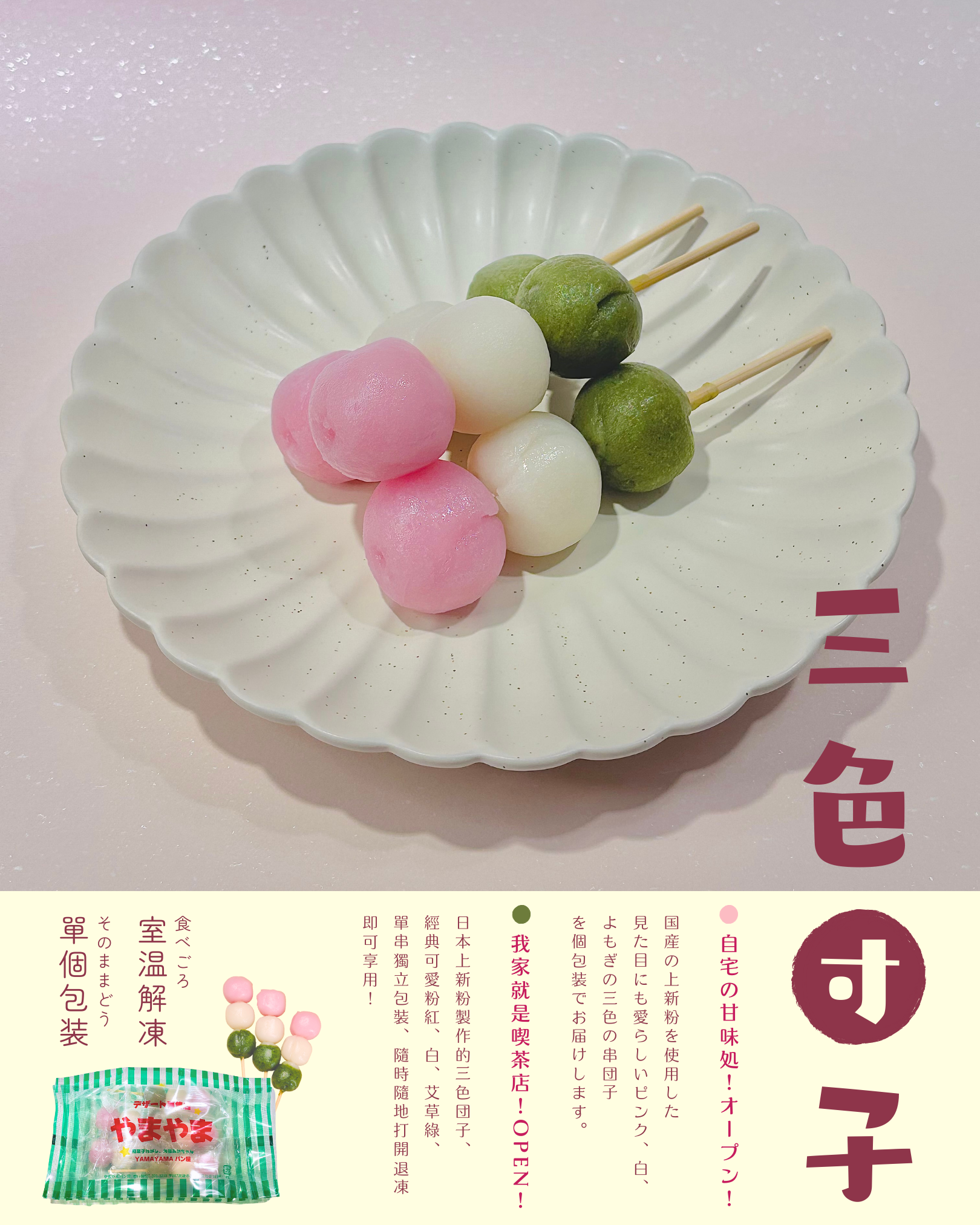 常溫解凍即可感受彈牙口感,淡淡的甜味伴著米香,甜而不膩的日本道地三色糰子。